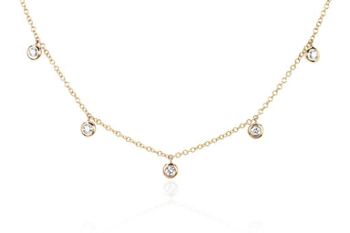 The 5 diamond bezel choker necklace features 5 bezel set diamonds (0.16 tcw) that hang from a 14k gold chain. Adjustable 14-15.5" chain