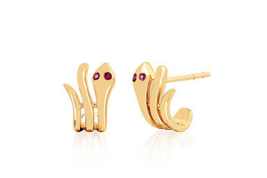 View full detailsOur gold snake earring with ruby eyes features 0.04 carats of ruby set in 14k gold. Sold as a pair Top of snake width measures: 8.5mm Snake heig...