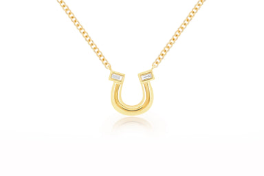 The Lucky Horseshoe Necklace features 0.02 carats of diamonds set in 14k yellow, rose, or white gold. Charm Height: 8 mm Charm Width: 7.5 mm