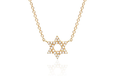 View full detailsOur diamond star of David necklace features 0.07 carats of diamond set in 14k gold. Star height measures: 8mm Star width measures: 8mm Total chain...